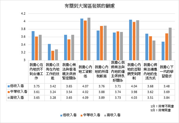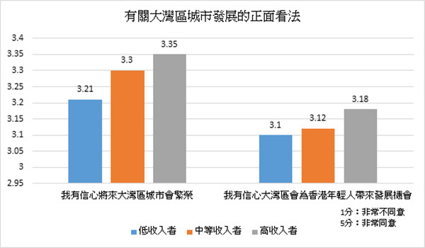 研究生院續指,受訪者需要就「有信心大灣區將來會繁榮」,以及「有信心大灣區能為香港年輕人帶來發展機會」這兩個項目給予評分,並以5分為最高;結果顯示兩項的平均分都高於3分,而高收入者的評分最高,分別為3.35及3.18分;但調查發現受訪者對「未來會否移居到大灣區城市」普遍持中立態度,所得平均分約2.5分;高收入者的評分還是最高,達到2.74分。