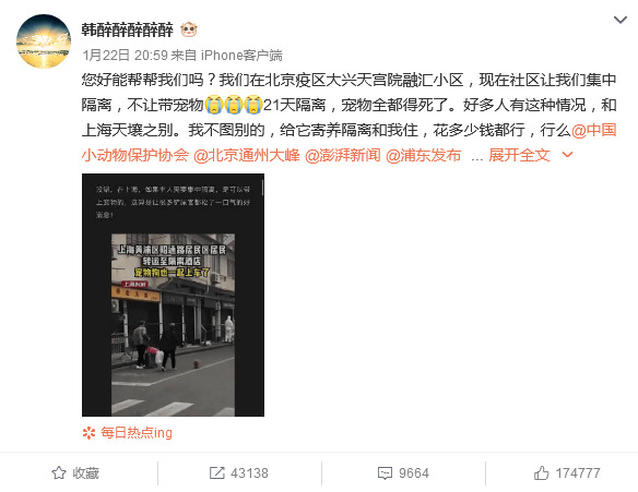 對於「集中隔離,家中寵物照料」問題,大興區副區長韓新星表示,近日大興區對天宮院街道融匯小區部分居民進行集中隔離觀察。在這一過程中,考慮到有些家庭飼養的寵物需要照料,在保證各項防疫要求嚴格落實到位的情況下,同意留下一名家庭成員居家隔離。