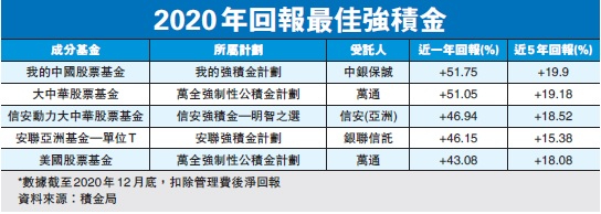 上榜頭五位去年回報介乎43.08%至51.75%,當中表現最強勁是中銀保誠強積金的「我的強積金計劃—我的中國股票基金」,2020年回報達51.75%。排第二是萬通信託的「萬全強制性公積金計劃—大中華股票基金」,回報亦有51.05%。