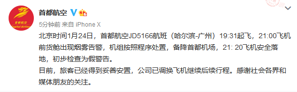 對此,首都航空稍晚作出回應稱,24日,首都航空JD5166航班(哈爾濱-廣州)19:31起飛,21:00飛機前貨艙出現煙霧告警,機組按照程序處置,備降首都機場,21: 20飛機安全落地,初步檢查為假警告。目前,旅客已經得到妥善安置,公司已調換飛機繼續後續行程。感謝社會各界和媒體朋友的關注。