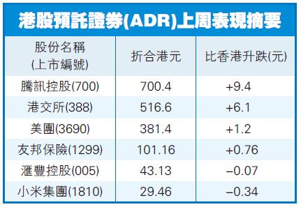 港股美國預託證券(ADR)普遍靠穩,騰訊(700)ADR折合港元重越700元關,較本港升逾1%。A股科創板股票下月納入「滬深港通」,港交所(388)ADR較港升逾1%。至於受美國制裁影響的中海油(883),其ADR較港收市再跌近3%。