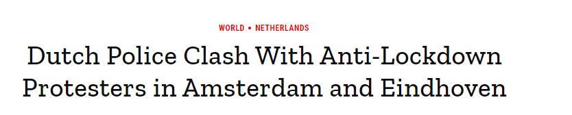荷蘭首都阿姆斯特丹及南部城市埃因霍溫,分別有示威者抗議政府因應疫情而實施的封鎖措施,期間與警方衝突。有示威者放火燒毀了檢測中心。