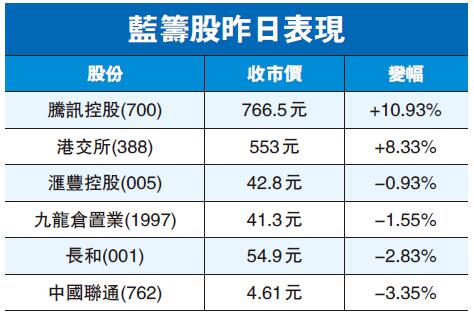 騰訊25日收報766.5元,狂飆10.93%,為表現最佳藍籌及國指成分股。港交所收報553元,飆升8.33%。除騰訊及港交所外,創新高的股份還包括創科實業(669)、舜宇光學(2382)、申洲國際(2313)及美團點評(3690)。創科實業收報126.8元,升4.28%。