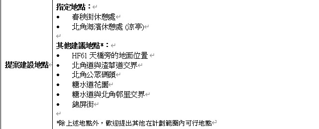 香港藝術中心透露,創意分子可由即日(26日)起至2月22日晚上6時或之前提交提案,提案要求是促進空間使用者相互交流,推動社區共議;塑造公共領域的多用性,回應社區需要以及創造愉快並具兼容性的空間使用體驗;至於提案建設的指定地點是春秧街休憩處和北角海濱休憩處 (涼亭),藝術中心還提出6個建議地點供有意參與者參考。