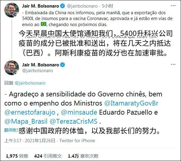 當地時間1月25日,博索納羅連發兩條推文,感謝中方迅速批准出口用於生產新冠疫苗的活性成分。巴西外交部長和農業部長亦轉發總統推文,並積極評價兩國關係。中國駐巴西大使楊萬明發推稱,團結是抗擊疫情的正確方式。