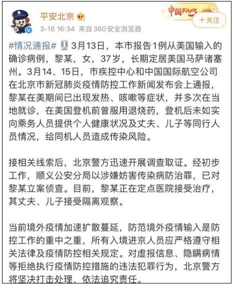 2020年3月13日,北京市報告1例從美國輸入的確診病例,黎某,女,37歲,長期定居美國馬薩諸塞州。(此前報道:隱瞞病情带家人從美回國的黎女士,被批捕!)