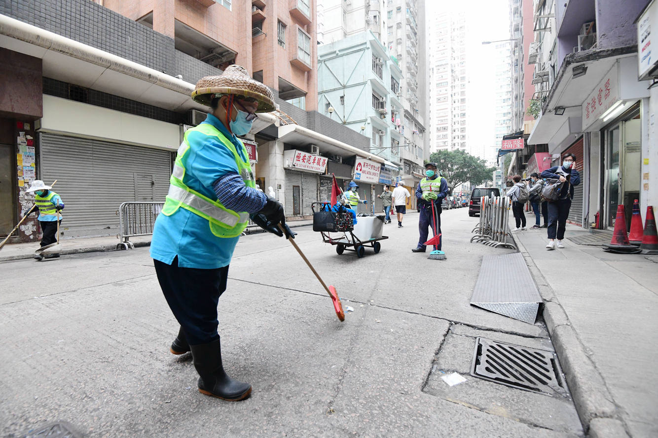油麻地碧街受限區域27日晨解封後,多名食環署人員在街道進行清潔消毒。記者崔俊良攝
