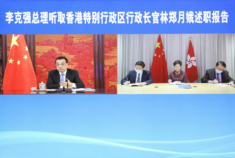27日上午,國務院總理李克強在中南海紫光閣以視頻連線方式聽取香港特區行政長官林鄭月娥2020年度的述職報告。林鄭月娥匯報了香港特區政府過去一年工作和新冠肺炎疫情防控等情況。