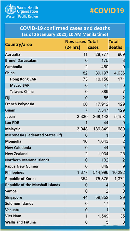 「世界衛生組織西太平洋區域」(World Health Organization Western Pacific Region)26日發布一張照片,內容包括全球新冠肺炎確診、死亡人數,台灣被歸類為中國一部分。台外事部門27日針對此事宣稱,「強烈抗議這種嚴重錯誤」,並要求世衛組織立刻予以更正。