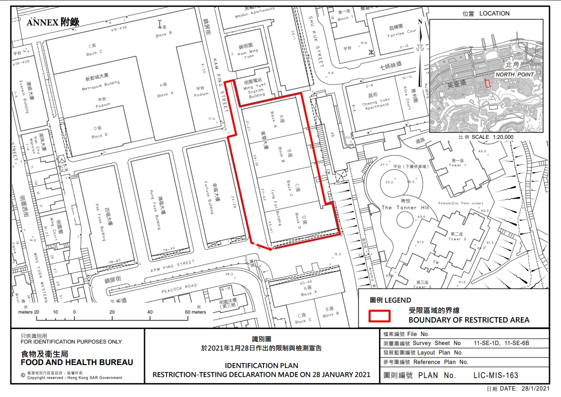 北角錦屏街東發大廈C座近期出現13宗確診個案,涉及不同單位和樓層。經過風險評估後,當局認為有需要就北角指明「受限區域」(即錦屏街東發大廈A、B、C、D座)作出限制與檢測宣告,確認「受限區域」內所有人士已接受強制檢測,截斷區內的傳播鏈,並藉此消除區內居民疑慮。政府引用《預防及控制疾病規例》第599J章,宣布由28日晚7時起限制在北角指明「受限區域」內的人士須留在其處所並按政府安排接受強制檢測。受檢人士須在其處所等候,直至區內所有已識別的受檢人士完成檢測,而相關檢測結果亦已獲大致確定,方可離開其處所,目標是在今早約7時完成強制檢測行動。