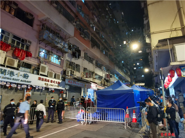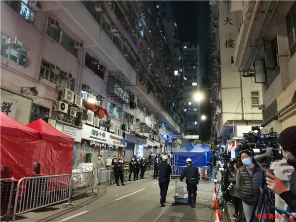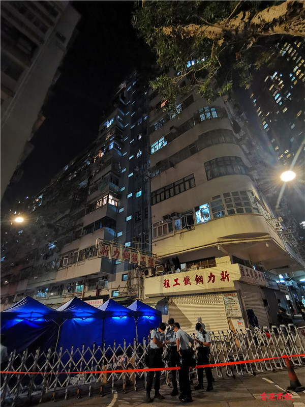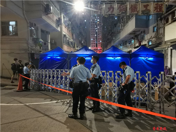 現場所見,大批警員及身穿保護衣的工作人員,当晚約7時已到東發大廈外,警員隨即拉起封鎖線,架設鐵閘及鐵馬。運送物資的貨車亦抵達現場,工作人員陸續架設檢測用的帳幕,並有貨車運送食品及日用品到場。