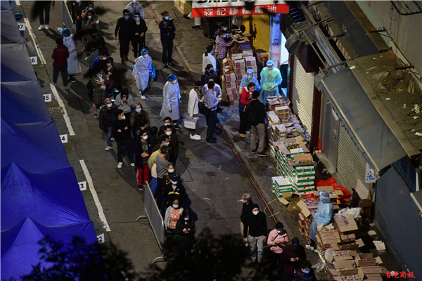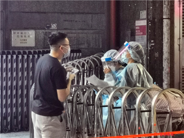 現場一位女士自稱住在A座、剛剛下班的女士表示,她中午已經做完檢測,明天中午要上班,擔心到時候出不去,所以打算去妹妹家借宿一宿。現場民政事務局的工作人員表示,如果這兩天有做檢測並登記資料,今晚就不用再做檢測。之後,該位女士登記資料後回到家中。