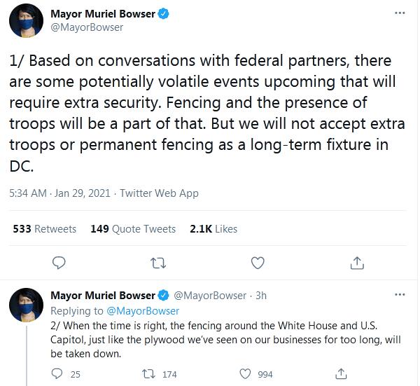 對此,華盛頓特區市長穆里爾·鮑澤則在推特上發文稱:「根據與聯邦合作夥伴的談話,對於(可能)發生的一些潛在的騷亂事件將需要額外的安全措施。圍欄和軍隊的存在將是其中的一部分。」