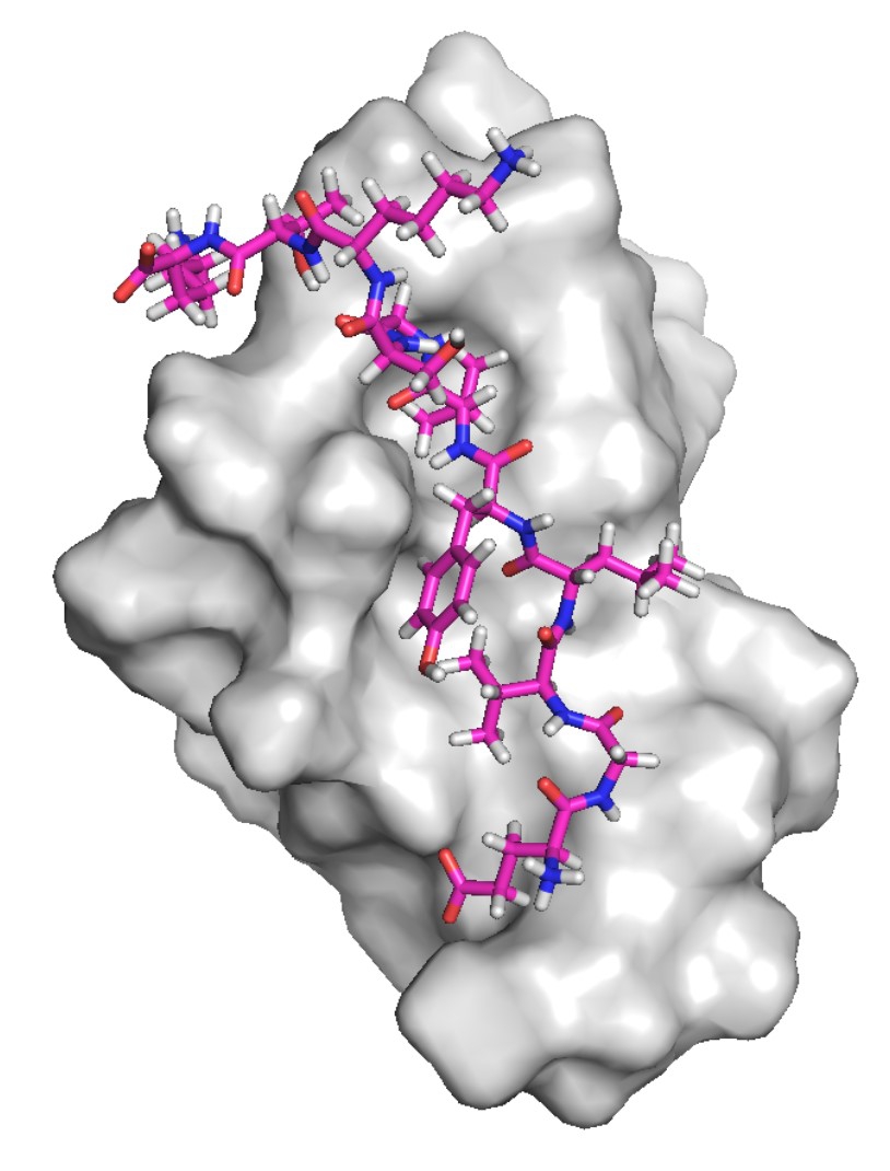 SUMO1(15-55)(灰色)與α-突觸核蛋白(紫紅色)結合的電腦類比對接模型。