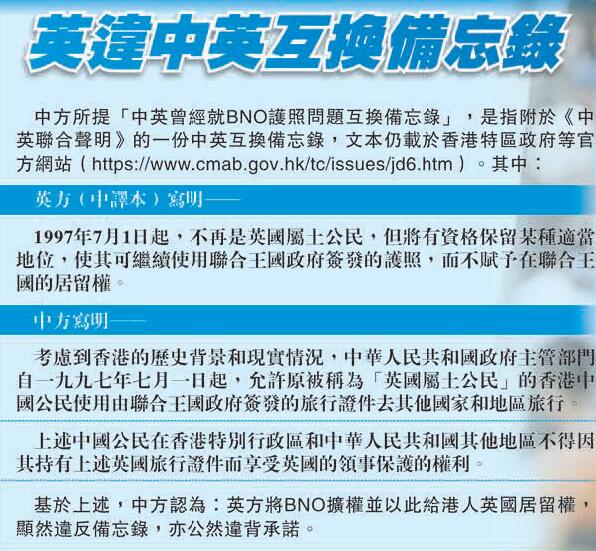 使館發言人指,中英曾就BNO護照問題互換備忘錄,英方在備忘錄中明確承諾不給予持有BNO護照的香港中國公民在英居留權。如英方不顧中方強烈反對和一再交涉,為有關人員在英居留和入籍提供路徑,將嚴重違背自身承諾,嚴重干涉中國內政,嚴重違反國際法和國際關係基本準則。