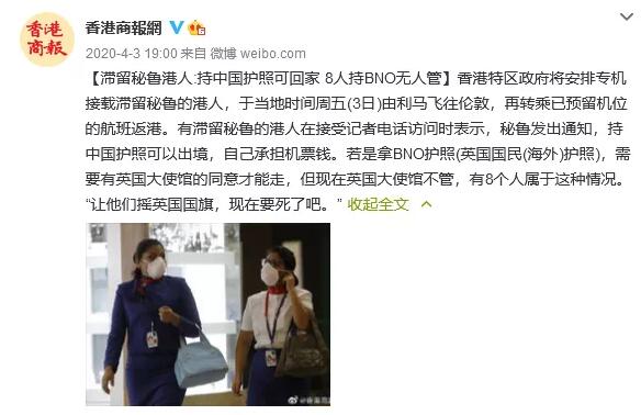 去年4月,正值國外疫情最嚴重之時,一批港人因秘魯宣布封國而滯留當地。在中國駐秘魯大使館的協調之下,香港特區政府派專機接這些港人回家。但是,只有持有中國護照的,才被允許出境回國,但持有BNO護照的港人則需要有英國大使館的同意才能走。但英國大使館壓根不樂意管,直接導致持BNO護照的8個香港人,沒有資格乘坐包機,繼續滯留秘魯。