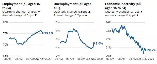 而據英國政府的勞動調查數據顯示,英國失業率自疫情后大幅上升,而就業率持續下降。截至2020年11月的前三個月中,英國的失業率估計為5.0%,比去年同期高1.2個百分點,比上一季度高0.6個百分點。