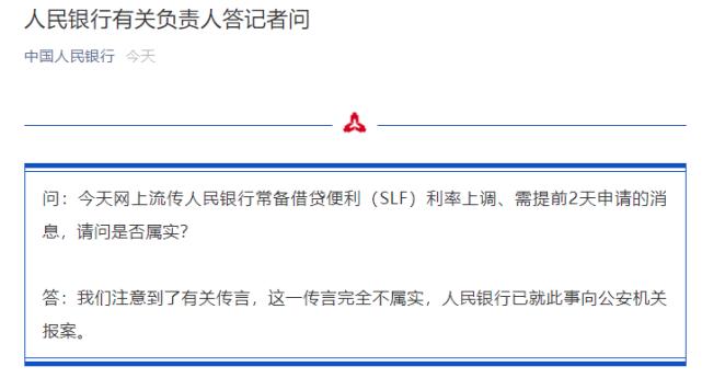 29日市場流傳一張截圖,上面流傳人行常備借貸便利(SLF)利率上調、需提前2天申請。傳言令弱不禁風的內地股市出現大面積恐慌,創業板指數一度跌近3%。上證綜指跌幅也擴大到1.6%。隨後人行緊急報案,並以答記者問的形式,就網上流言進行闢謠,並已就此事向公安機關報案。之後,國債期貨短線快速拉升翻紅。中國10年期國債現券200006收益率由漲轉跌,目前收益率下跌1BP報3.185%,此前最高一度達3.23%。股市方面,三大指數均V型反彈,但是收盤仍然明顯收陰,上證綜指收盤下跌22個點或0.63%,報3483點;深證成指跌91個點或0.61%,報14822點;創業板指數跌33個點或1.04%,報3128點。