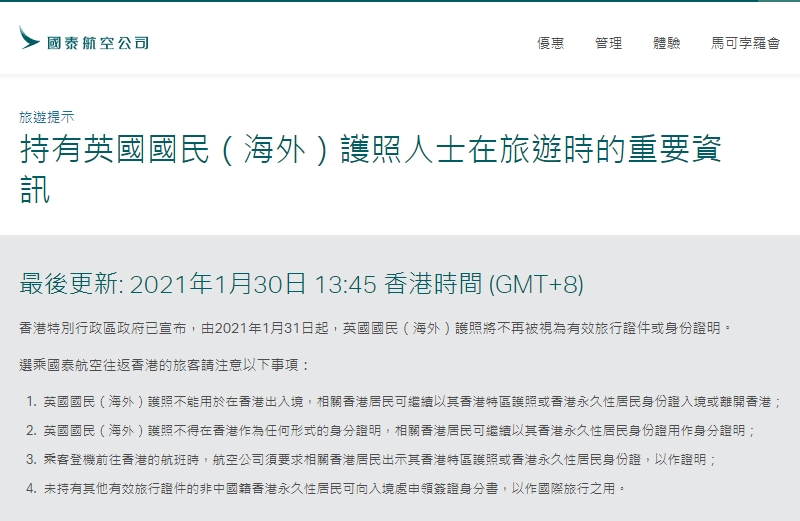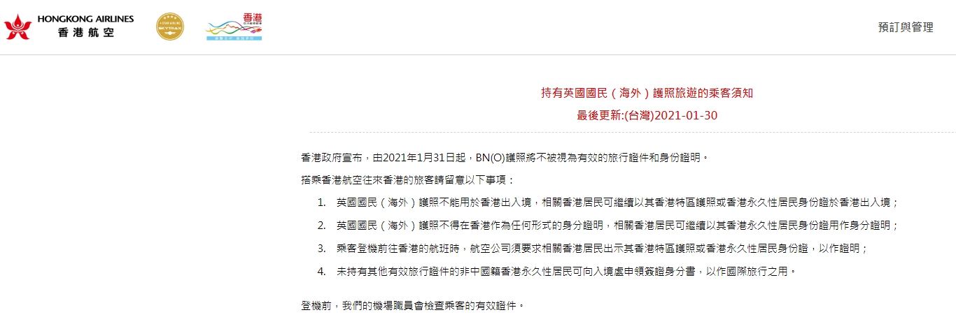 目前,國泰航空和香港航空都各自在其官方網站發布通知,提醒香港乘客登機前往香港時,須出示特區護照或永久性居民身份證作為證明。