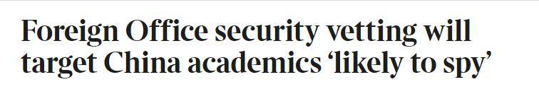 據英國泰晤士報30日報道,英國政府會對有意研究國家安全的海外學者和研究員進行安全審查,以防知識產權被侵犯,或令成千上萬的中國學者和研究人員被禁入境,已獲批簽證在英國讀書或工作的中國人,如被視為構成風險,簽證亦會被註銷。英國政府警告大學稱,所謂「有敵意的國家級角色」會針對英國學院竊取個人資料、研究資料和知識產權,或用於軍事、商業等。