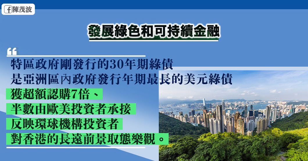 上星期二(1月26日)本港完成第二批政府綠色債券發行,規模25億美元,是全球最大的政府類別美元計價綠色債券。2051年到期的30年債券超額認購7倍,高於5年及10年期各5倍的超額認購,且半數由歐美投資機構承接。這也是本港府迄今年期最長的債券,以及亞洲至今最長年期的政府類別美元計價債券。反映環球機構投資者對本港長遠信貸狀況及經濟基調充滿信心,對香港長遠前景樂觀。