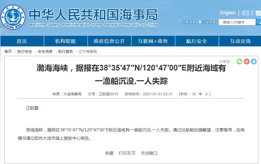 據大連海事局官網消息,渤海海峽,據報在38°35′47″N/120°47′00″E附近海域有一漁船沉沒,一人失蹤。請過往船舶加強瞭望,注意搜尋,如有情況請立即向大連市海上搜救中心報告。
