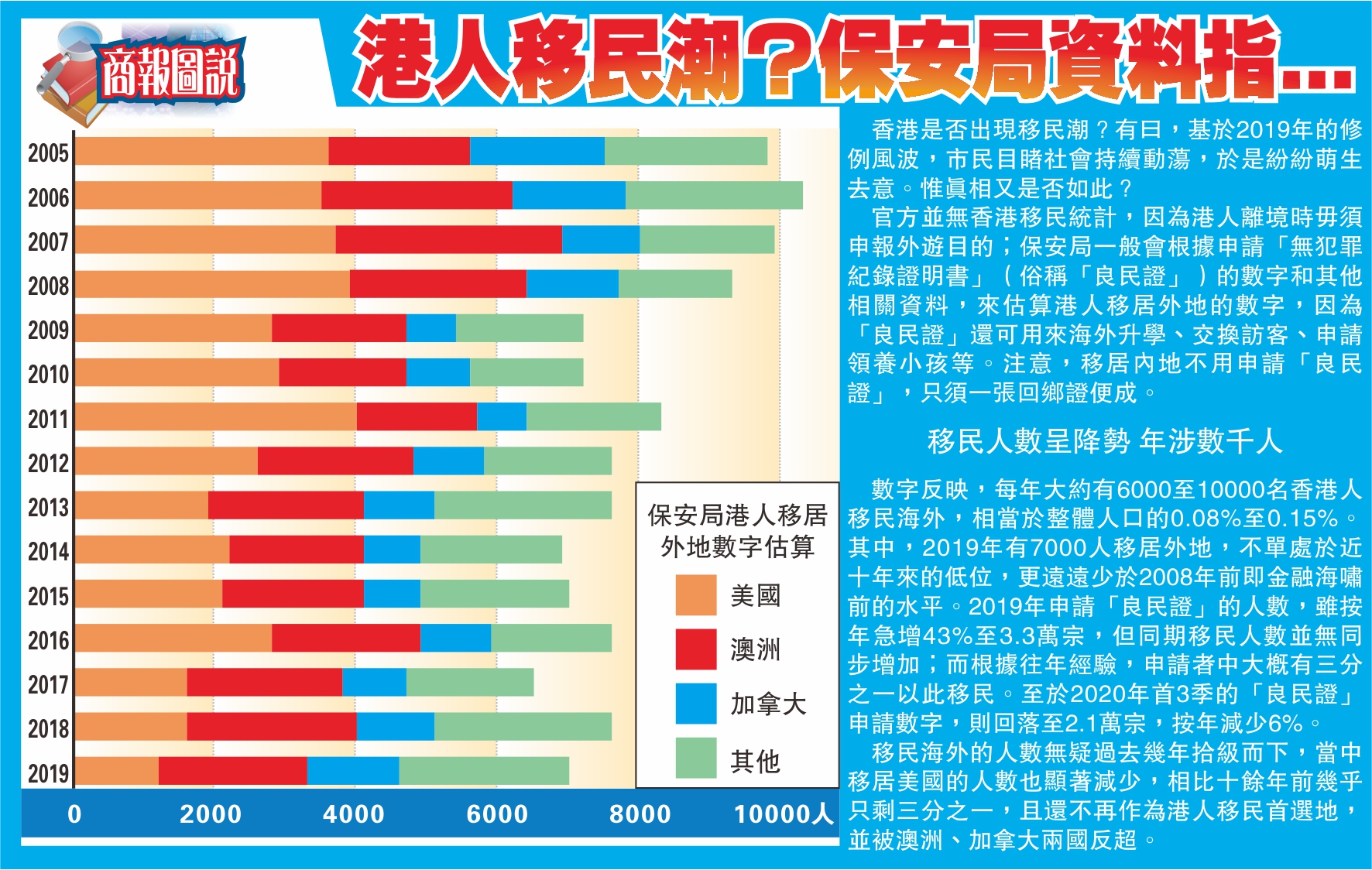 數字反映,每年大約有6000至10000香港人移民海外,相當於整體人口的0.08%至0.15%。其中,2019年有7000人移居外地,不單處於近十年來的低位,更遠遠少於2008年前即金融海嘯前的水平。2019年申請「良民證」的人數,雖按年急增43%至3.3萬宗,但同期移民人數並無同步增加;而根據往年經驗,申請者中大概有三分之一以此移民。至於2020年首3季的「良民證」申請數字,則回落至2.1萬宗,按年減少6%。