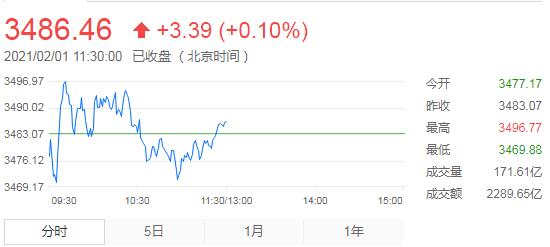2月1日,星期一,農曆十二月二十。在上周末連續兩日大幅下跌后,今日A股表現淡靜。三大指數開盤漲跌不一,機場航運跌幅居前。隨後,創指、深成指漲幅先後擴大至1%。隨後整體回落,午盤再度回暖,注冊制次新股大漲,煤炭、疫苗、黃金等較為活躍,雲遊戲、機場航運等領跌,兩市個股漲跌參半,漲停60余家,跌停約80家,市場氛圍較差,資金情緒表現較為謹慎。截止上午收盤,滬指報3486.46點,漲0.10%,成交額為2290億元;深成指報14943.73點,漲0.82%,成交額為3094元;創指報3164.75點,漲1.15%,成交額為1122億元。