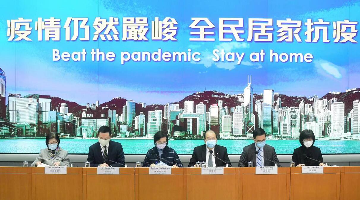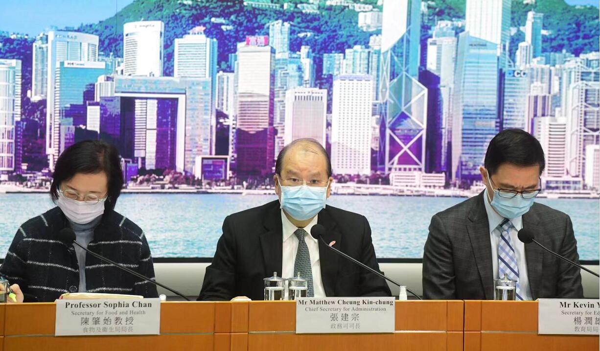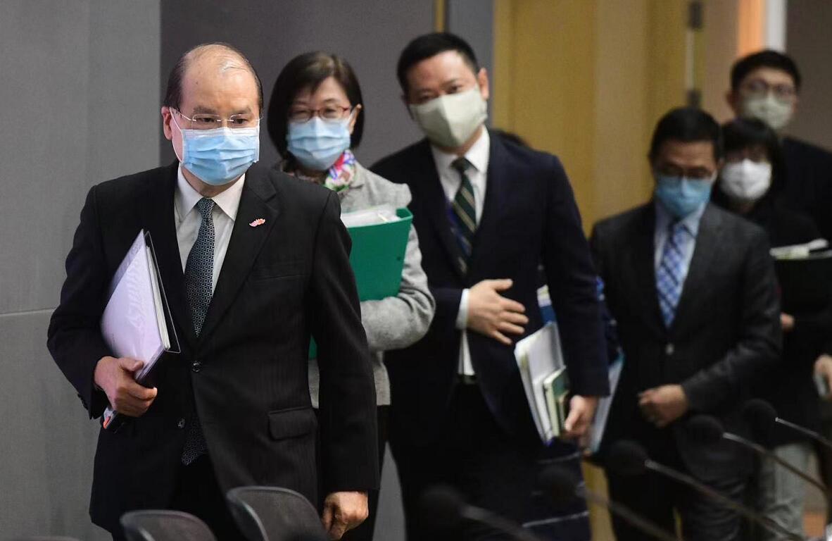 政務司司長張建宗、食衞局局長陳肇始、教育局局長楊潤雄、民政事務局局長徐英偉、衞生署署長陳漢儀醫生和食環署署長劉利群出席1日下午防疫抗疫措施記者會。