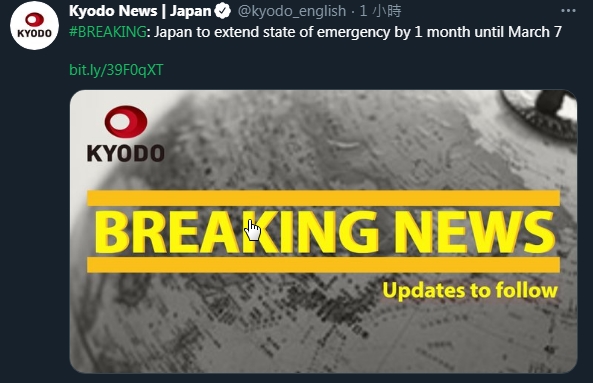 日本共同社報道,一位知情人士周一表示,日本政府計劃將緊急狀態延長1個月,直到3月7日。首相菅義偉將在周二專家組聽證會後,就延期作出最後决定。