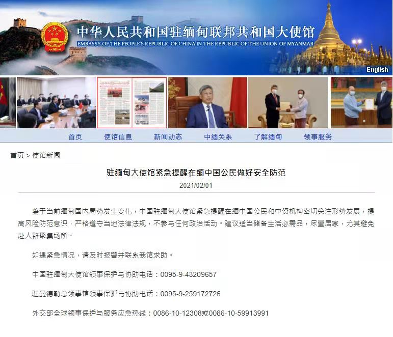 鋻於當前緬甸國內局勢發生變化,中國駐緬甸大使館周一緊急提醒在緬中國公民和中資機構做好安全防範。