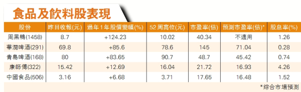 中金認為,值得關注的消費股,包括潤啤、青啤、百威亞太、中國飛鶴(6186)、周黑鴨(1458)、康師傅(322)、中國食品(506)、H&H(1112)及萬洲國際(288)。
