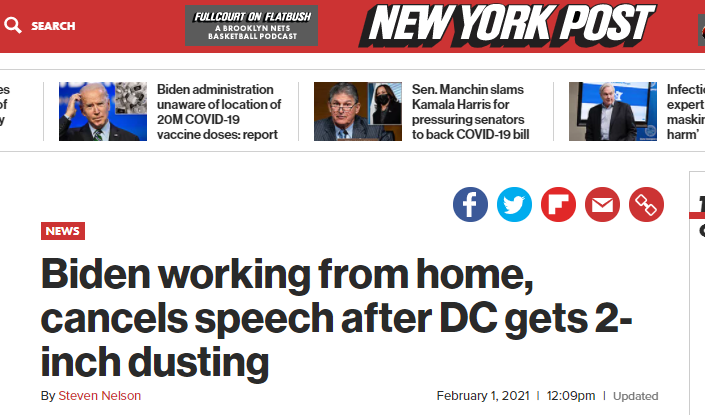 《紐約郵報》:拜登在家辦公,在華盛頓積雪達到2英寸厚,拜登取消了國會演講