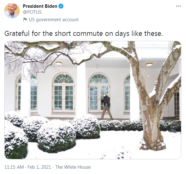 當地時間1月31日22時許,拜登在推特上發布了一則推文:「感謝在這樣的日子裏短途通勤。」這則推文還配上了一張照片。照片中,白宮內已是白雪皚皚。拜登正走在白宮西翼的走廊上,照片中的他穿著深色夾克,戴著口罩,左手還拿著一個文件夾。↓