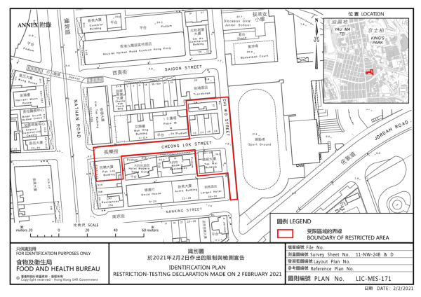 政府今日(2月2日)晚上7時再於佐敦、深水埗及天水圍實施圍封強制檢測。將佐敦長樂街23至27號、長樂街22至28號、志和街13號及彌敦道322-326A號;深水埗介乎基隆街239至263號、南昌街89號、大南街256至280號、北河街60至74號一帶範圍內的17幢大廈;以及天水圍天恒邨恒樂樓,列為指定「受限區域」。特首林鄭月娥、食物及衞生局長陳肇始、民政事務局長徐英偉晚上11時到深水埗「受限區域」視察。