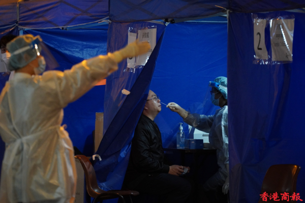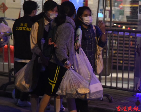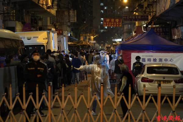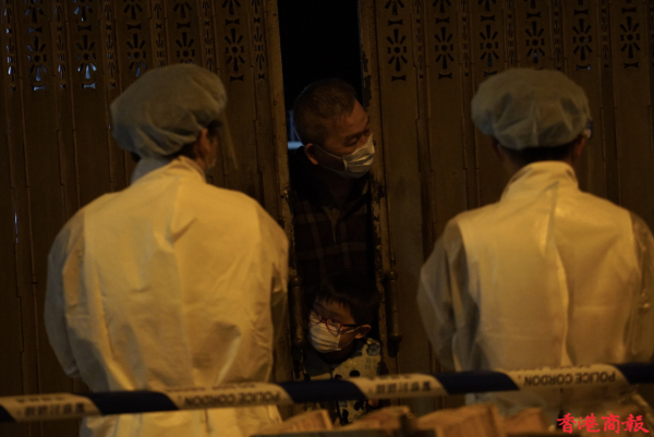 封鎖區佐敦長樂街百樂大廈居民接受病毒測試,並領取食物。(蔡啟文攝)