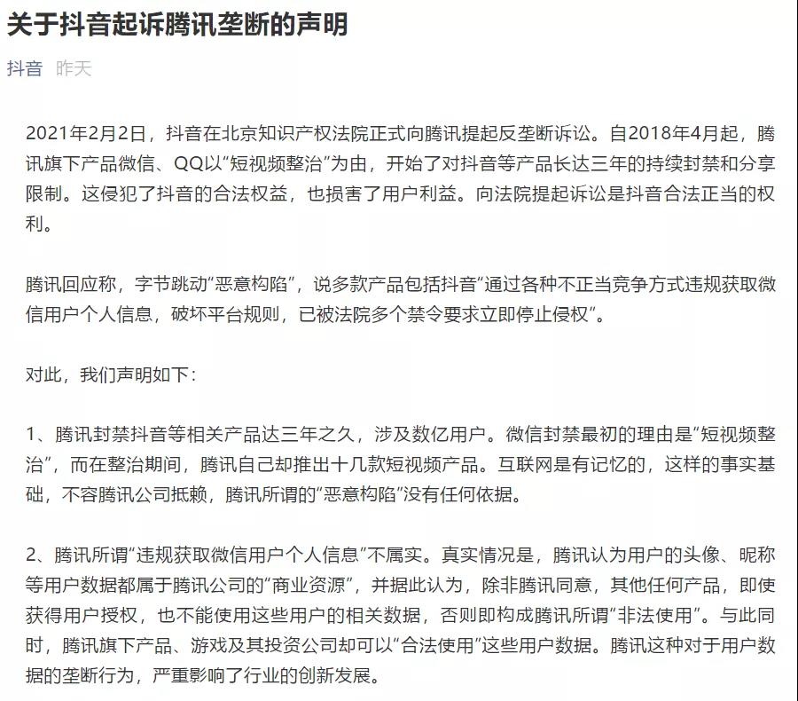 2月2日,字節跳動旗下的抖音宣布,向北京知識產權法院正式提交訴狀,起訴騰訊涉嫌壟斷。