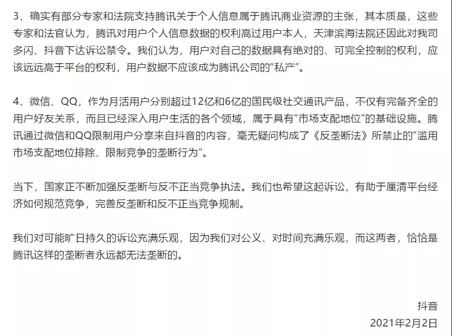 對此,抖音認為,「用戶對自己的數據具有絕對的、可完全控制的權利,應該遠遠高於平台的權利,用戶數據不應該成為騰訊公司的『私產』。」