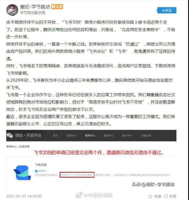 1月7日,字節跳動副總裁謝欣在微頭條上發文稱,由於微信開放平台的不開放,「飛書文檔」微信小程序已經在審核流程上被卡將近兩個月了。