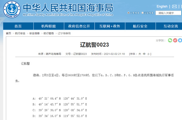 據葫蘆島海事局消息,2月3日至4日渤海部分海域執行軍事任務,詳情如下: