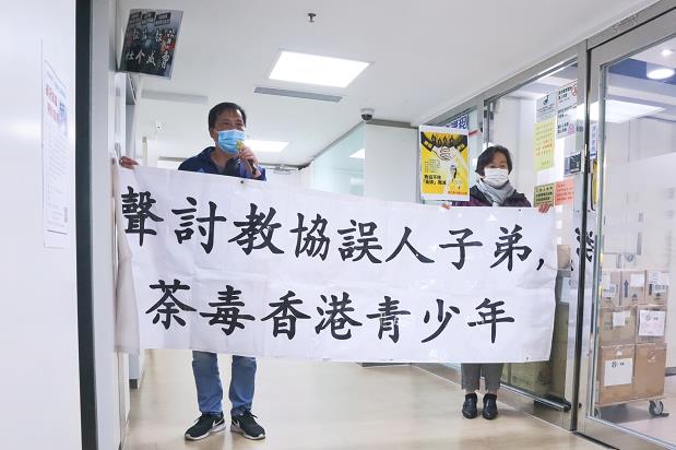 再有市民今日到教協請願,批評教協散播暴力、教壞學生,令他們去做「黑衣人」去「搞暴亂」,更明目張膽在校園鼓吹分裂國家。又指,他們這些教壞學生的做法,並不是老師應有的行為,批評他們只會教壞小朋友,令社會更加分化,故今日前來聲討教協,希望教協能正視問題。(記者何加祺 馮瀚文攝)