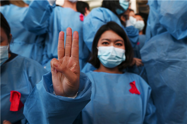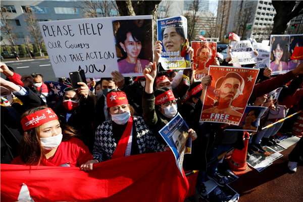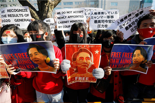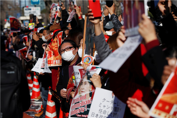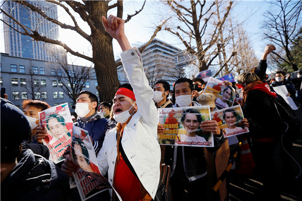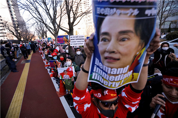 緬甸國務資政昂山素姬2月1日被緬甸軍方扣押,在獲得10年人身自由後再度身陷囹圄,至今下落不明。曾獲西方世界力挺的昂山素姬在當政后,深陷羅興亞人危機漩渦,被指未有制止軍方迫害羅興亞人,並為軍方行為加以辯護,遭到西方國家批評及攻擊,在海外聲望大不如前。然而在緬甸國內,她的支持度仍然很高。2月3日,在緬甸仰光總醫院,一群身穿紅絲带的醫務人員集会抗議推翻民選領導人昂山素姬的政變。在日本東京外交部外,居住在日本的緬甸侨民舉著印有領導人昂山素姬照片的標語,抗議緬甸軍方從民選文職政府手中奪取政權並逮捕昂山素姬。(图源:路透社)