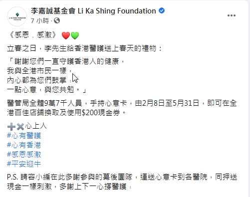 李嘉誠基金會在社交媒體表示,長和系創辦人李嘉誠在立春之日向香港醫護人員送出「春天的禮物」,向醫管局全體9.7萬名人員派發心意卡。醫護人員只需手持心意卡,由2月8日至5月31日,即可在全港百佳店鋪換取及使用$200現金券。