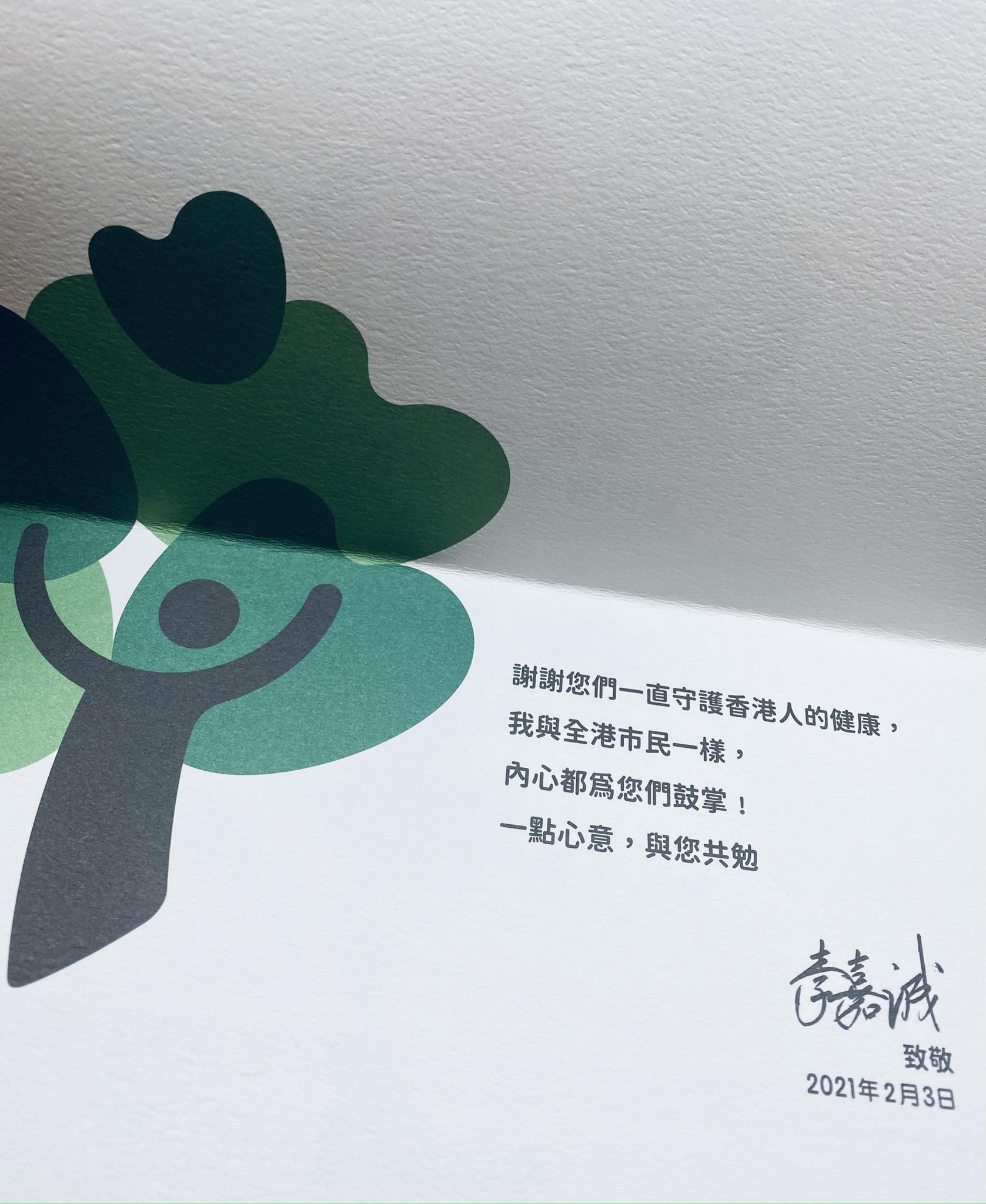 李嘉誠在心意卡上寫道:「謝謝您們一直守護香港人的健康,我與全港市民一樣,內心都為您們鼓掌﹗一點心意,與您共勉 。」
