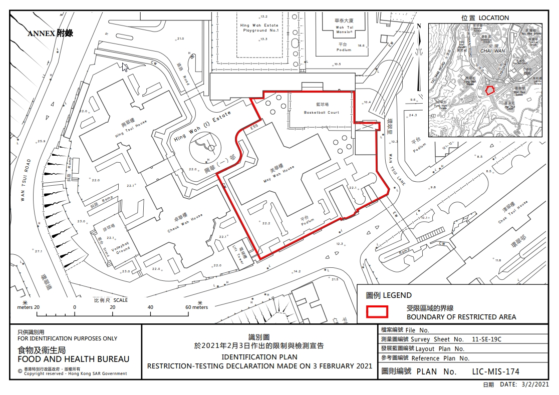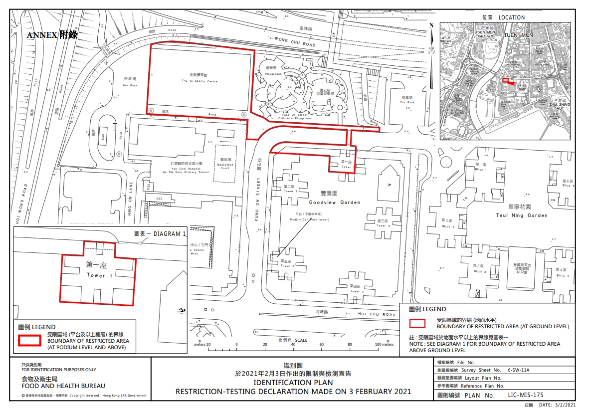 政府今(3日)晚7時宣布引用《預防及控制疾病(對若干人士強制檢測)規例》(第599J章)作出限制與檢測宣告,指自下午七時起限制在柴灣環翠道11號興華(一)邨美華樓,以及屯門海珠路7號豐景園第一座內的人士,須留在其處所並接受強制檢測。受檢人士須在其處所等候,直至區內所有已識別的受檢人士完成檢測,而相關檢測結果亦已獲大致確定,方可離開其處所。政府目標是在4日上午約7時左右完成此行動。