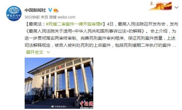 據中國新聞社官方微博消息,4日,最高人民法院召開發布會,發布《最高人民法院關於適用<中華人民共和國刑事訴訟法>的解釋》。會上介紹,為進一步貫徹落實兩審終審制、完善死刑案件審判程序、保證死刑案件質量,上述司法解釋規定,被告人被判處死刑的上訴案件,包括死刑緩期二年執行的案件,第二審人民法院一律應當開庭審理;被判處死刑立即執行、死刑緩期二年執行的被告人沒有上訴,同案的其他被告人上訴的案件,第二審人民法院也應當開庭審理。