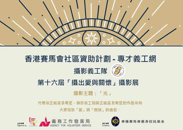 義務工作發展局指,第16屆「攝出愛與關懷」攝影展會於1月18至2月18日於網上進行,並展出56幀由「攝影義工隊」隊員以「光」為主題的作品,而攝影展是期望在新冠肺炎疫情下向社會大眾傳遞「希望」和「正能量」。