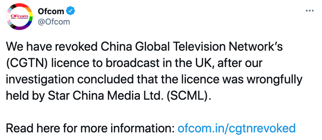 英國通訊管理局(Ofcom)4日發布聲明,稱當天已撤銷中國國際電視台(CGTN)在英國開展廣播的執照。Ofcom稱,根據此前調查得出的結論,該執照由星空華文傳媒Star China Media Limited(SCML)不當持有。