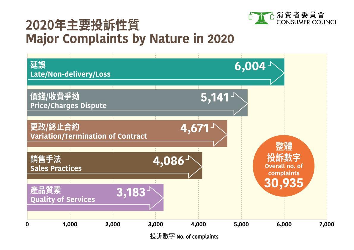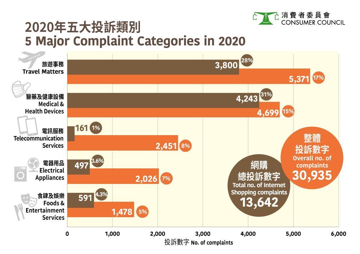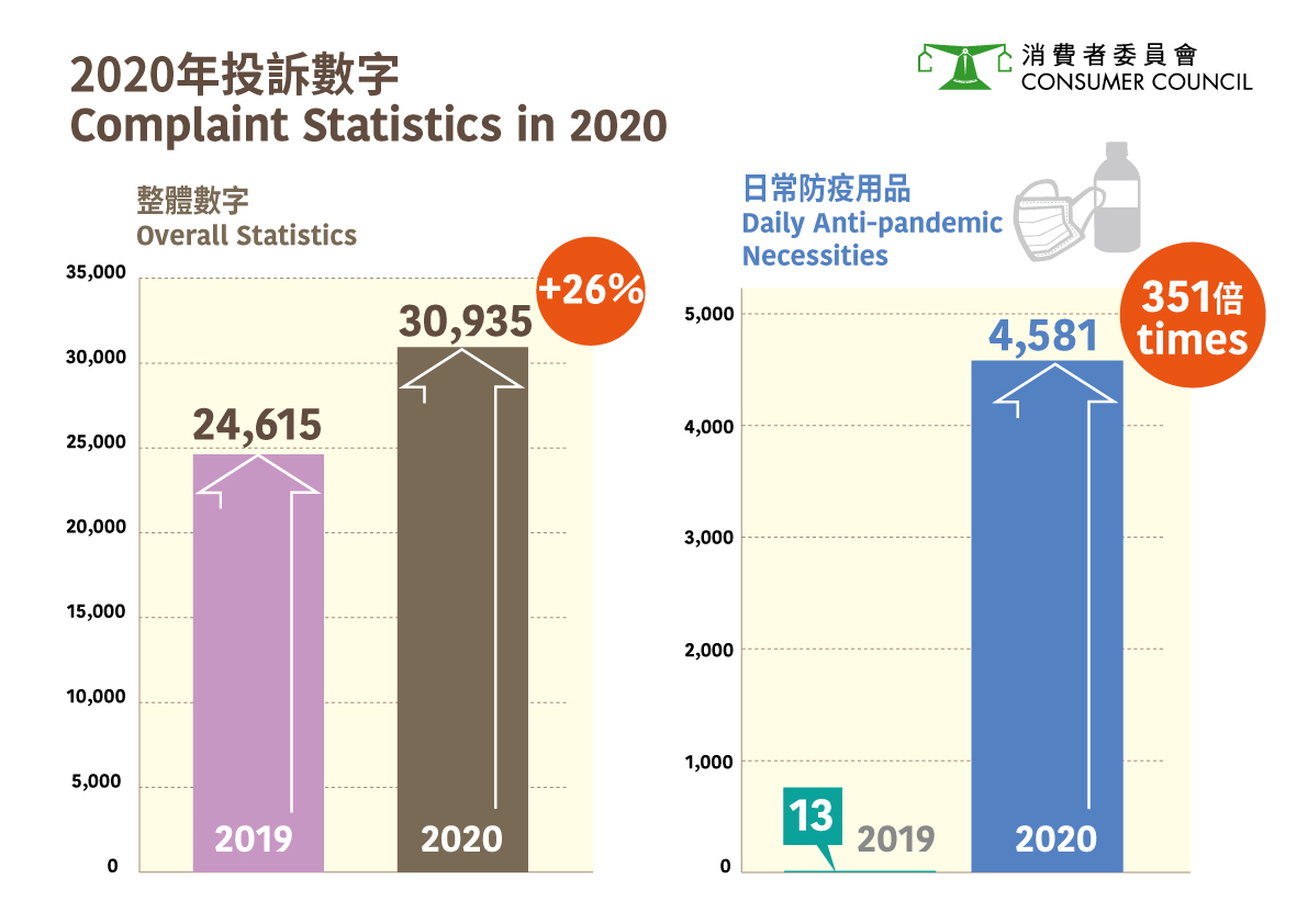 消費者委員會指,它們在2020年接獲合共30935宗投訴,數字較2019年上升26%,是 2015 年以來最高。