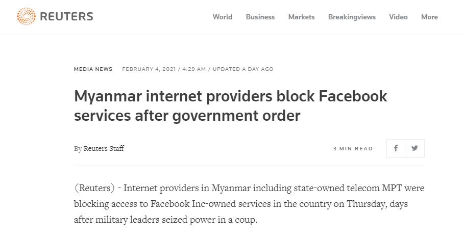 據路透社報道,目前由緬甸軍方接管的政府,已於4日下令電信運營商臨時禁止對Facebook服務的訪問,禁令將持續到2月7日午夜。